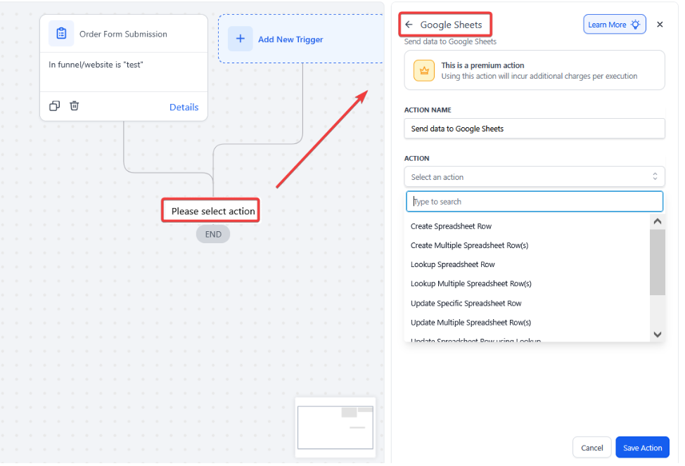 - Select the action to create a new row in Google Sheets (or any other external platform).