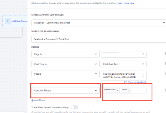 - This filter option triggers the workflow when the comment includes a specific phrase or a set of keywords and allows for broader matching. Any comment containing the specified phrase, regardless of additional words or context, will trigger the workflow.