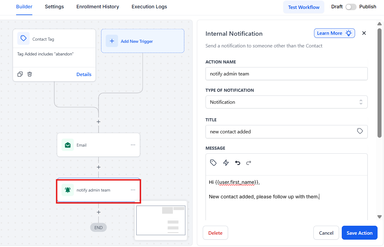 - Notify Your Team: Send an internal notification to your sales team: “A new contact tagged as ‘Interested’ needs follow-up. Contact details: {{contact.details}}.”