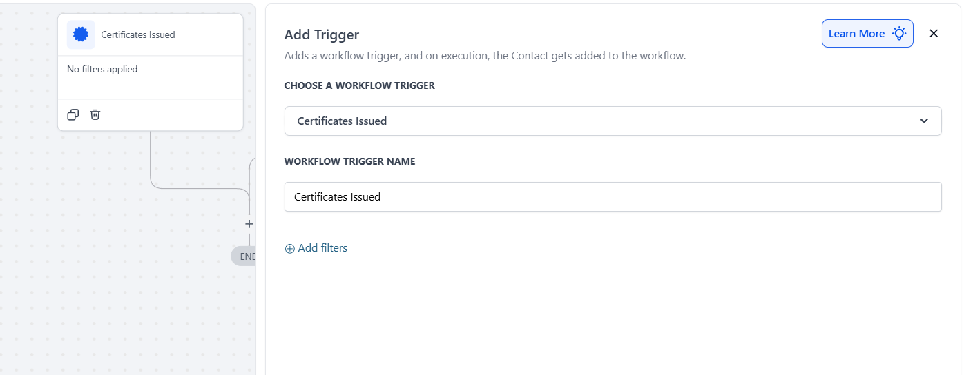 2- Select Certificates Issued Trigger: Within the Workflow Builder interface, locate the Certificates Issued trigger among the available options.