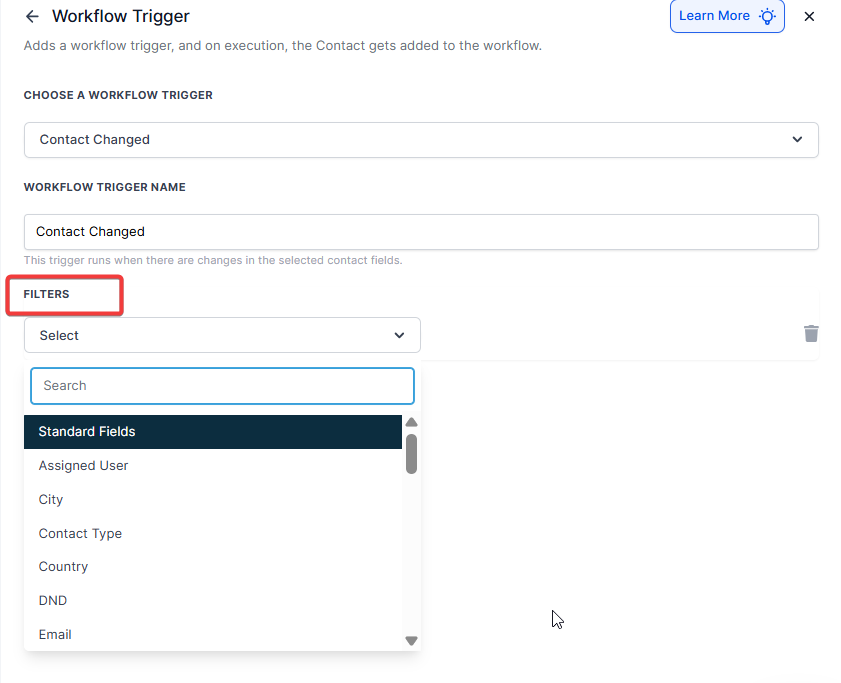 - Choose “Contact Changed” as the Workflow Trigger.