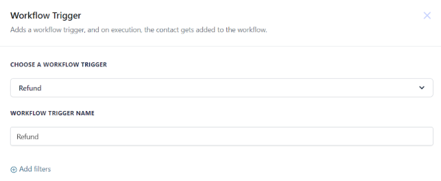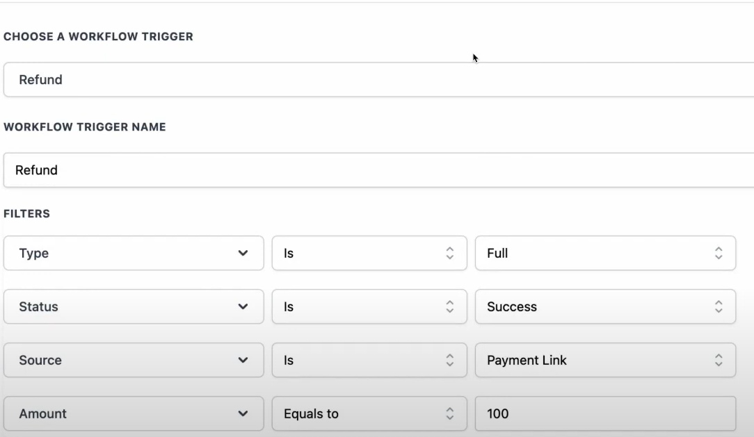 Under the "Filters" section, define the specific conditions for the refund trigger. This includes selecting the refund event that should trigger the workflow, such as successful or failed refunds, full or partial amounts, or specific sources of the refund.