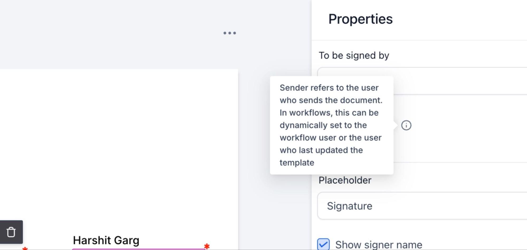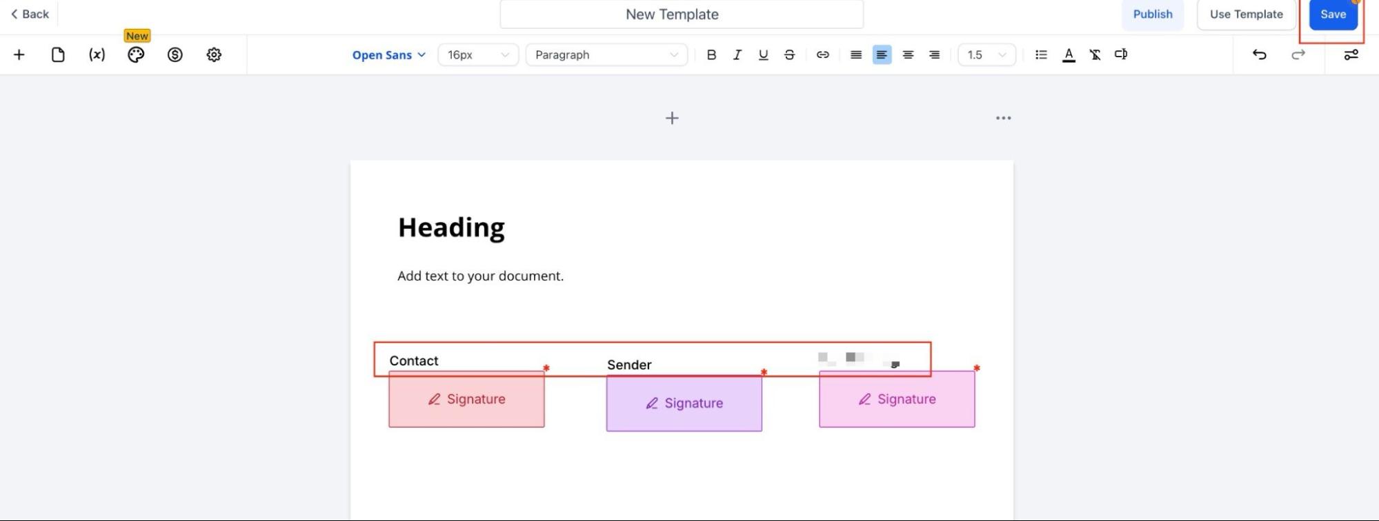 Note: You can now link fillable fields in your Documents & Contracts templates directly to the Workflow 'From user'. For that, Create a Template with Sender Field in Payments > Documents & Contacts > Templates. Open the template editor by clicking New. Add a Signature (or any fillable field) and set “To be signed by” to Sender. Save the template.