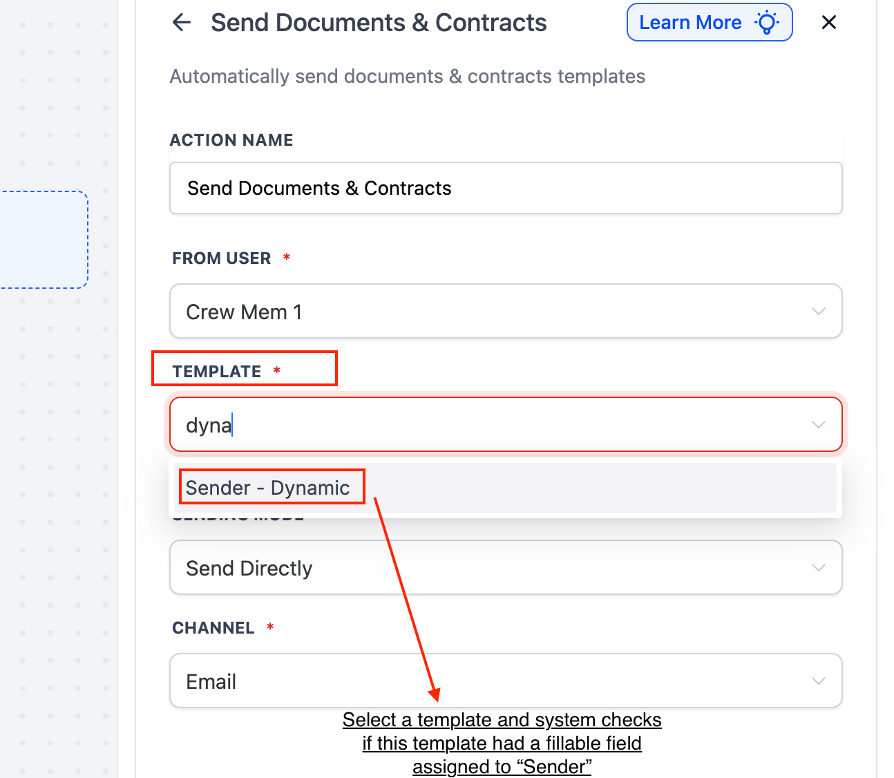 Note: For assigning fillable fields in your Documents & Contracts templates directly to the Workflow 'From user', first use From User to set your email credentials in the workflow you are setting up. Then, pick a template that includes Sender fields. The system will automatically check to make sure they're included. In the Assign Sender Fields To section, choose From User if you want the person sending the workflow to act as the signer. Alternatively, select Template Owner if the signing responsibility should fall to whoever most recently modified the template.
