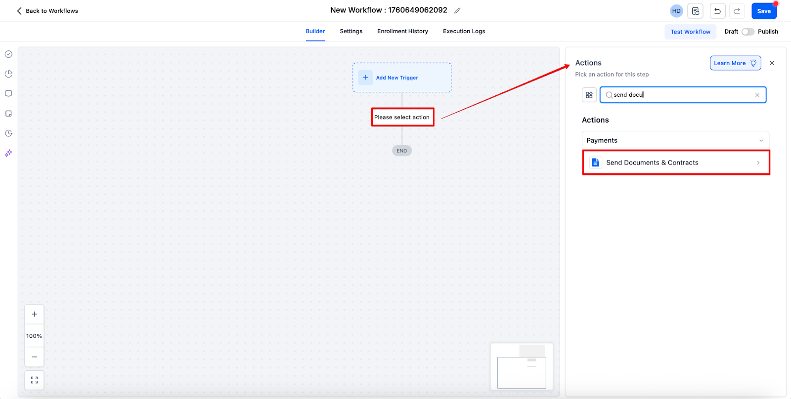 - In the workflow editor, add the action “Send Documents & Contracts.”