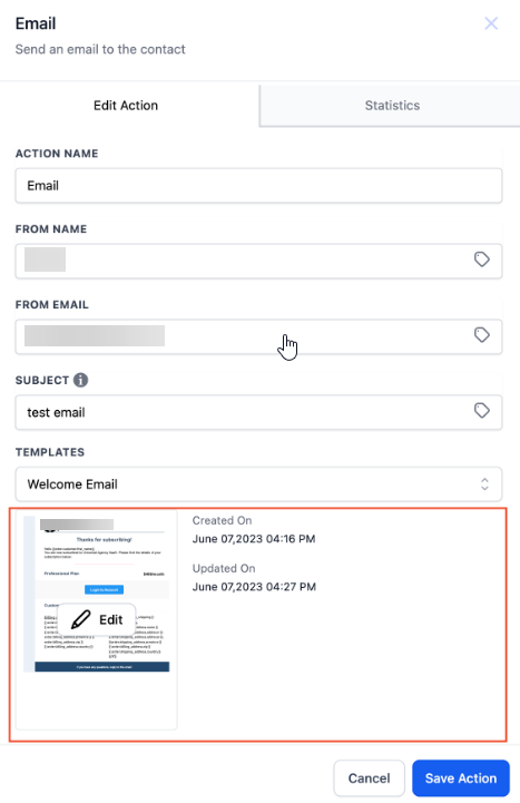 In the "Send Email" action, open the template, make changes using the drag-and-drop editor, and select "Save as New Template" to create new versions. This leaves the original template unchanged.