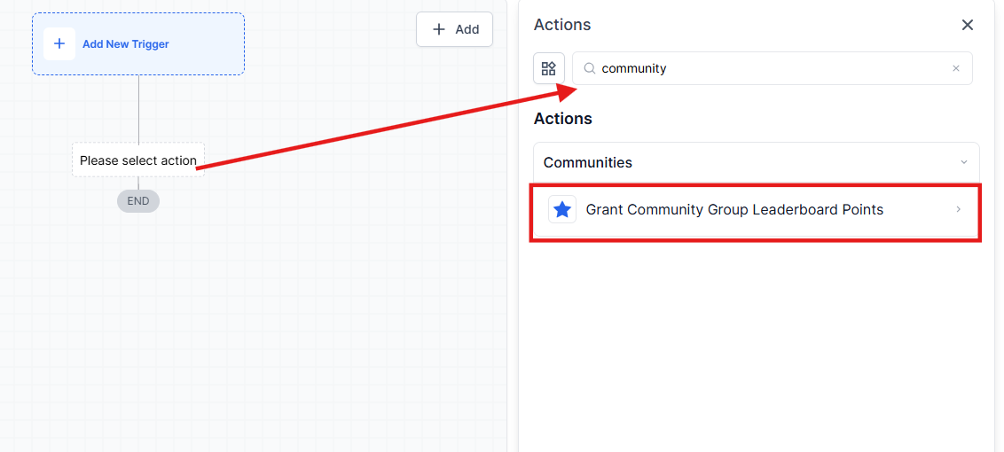 1. Select the Action: Choose the "Grant Community Group Leaderboard Points" action to allocate points for specific activities.