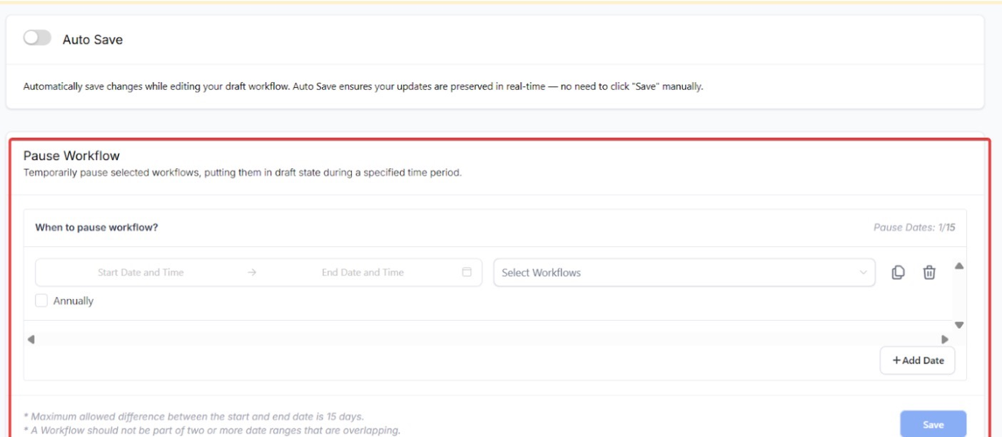 Once all configurations are complete, click Save to apply the changes. The selected workflows will now be paused during the specified dates.