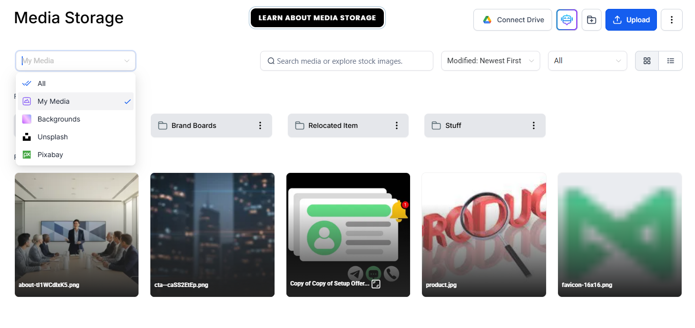 Once in the Media Storage, you can upload content, create folders for your content, and search through your existing media, pixabay, system backgrounds, or Unsplash.