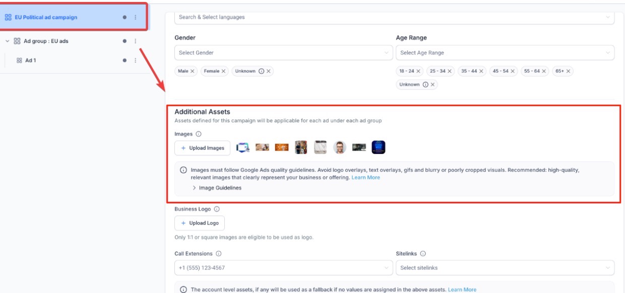 Image assets can be added to search ad campaigns to enhance visual appeal and boost engagement across various ad placements. To use this, In the Additional Assets section, select Upload Images to begin.