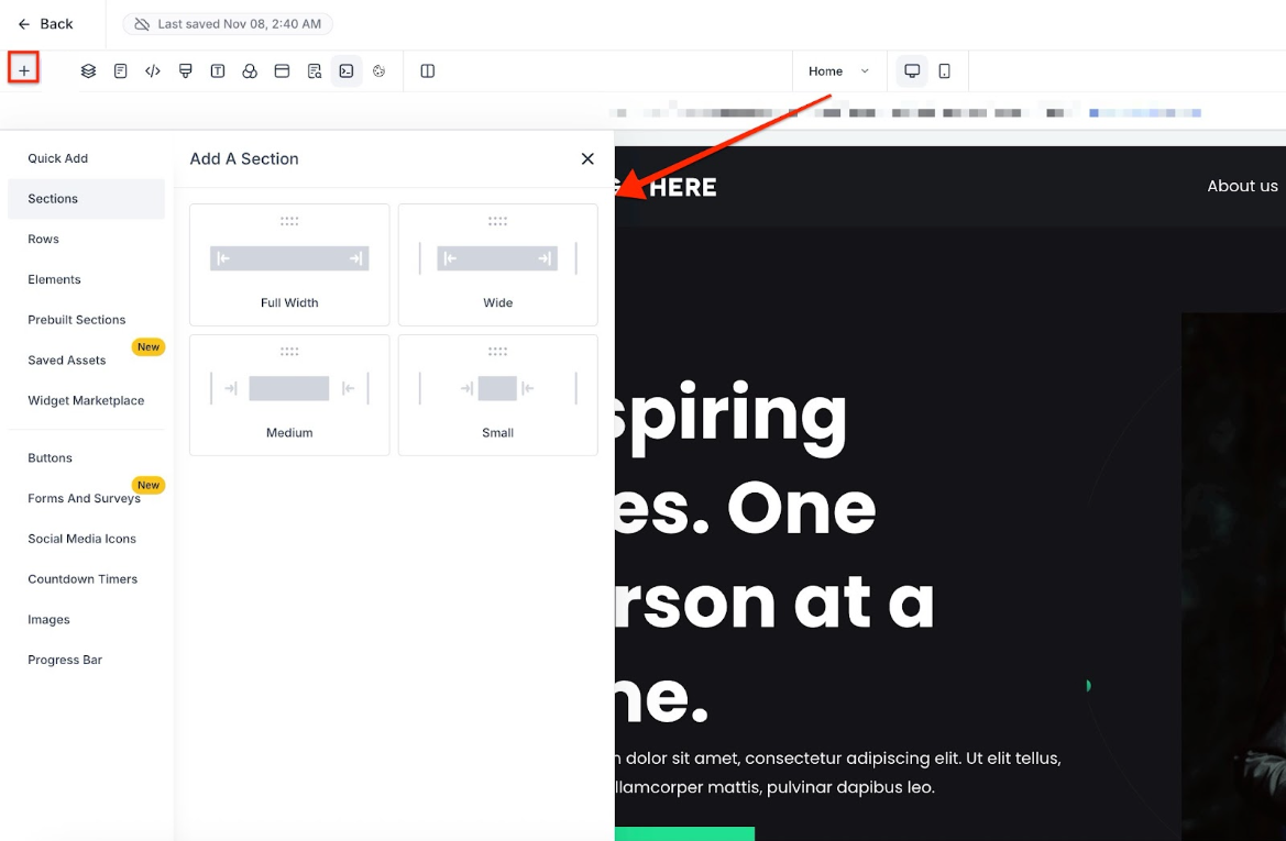- Click on the + icon on the top left, and add a section