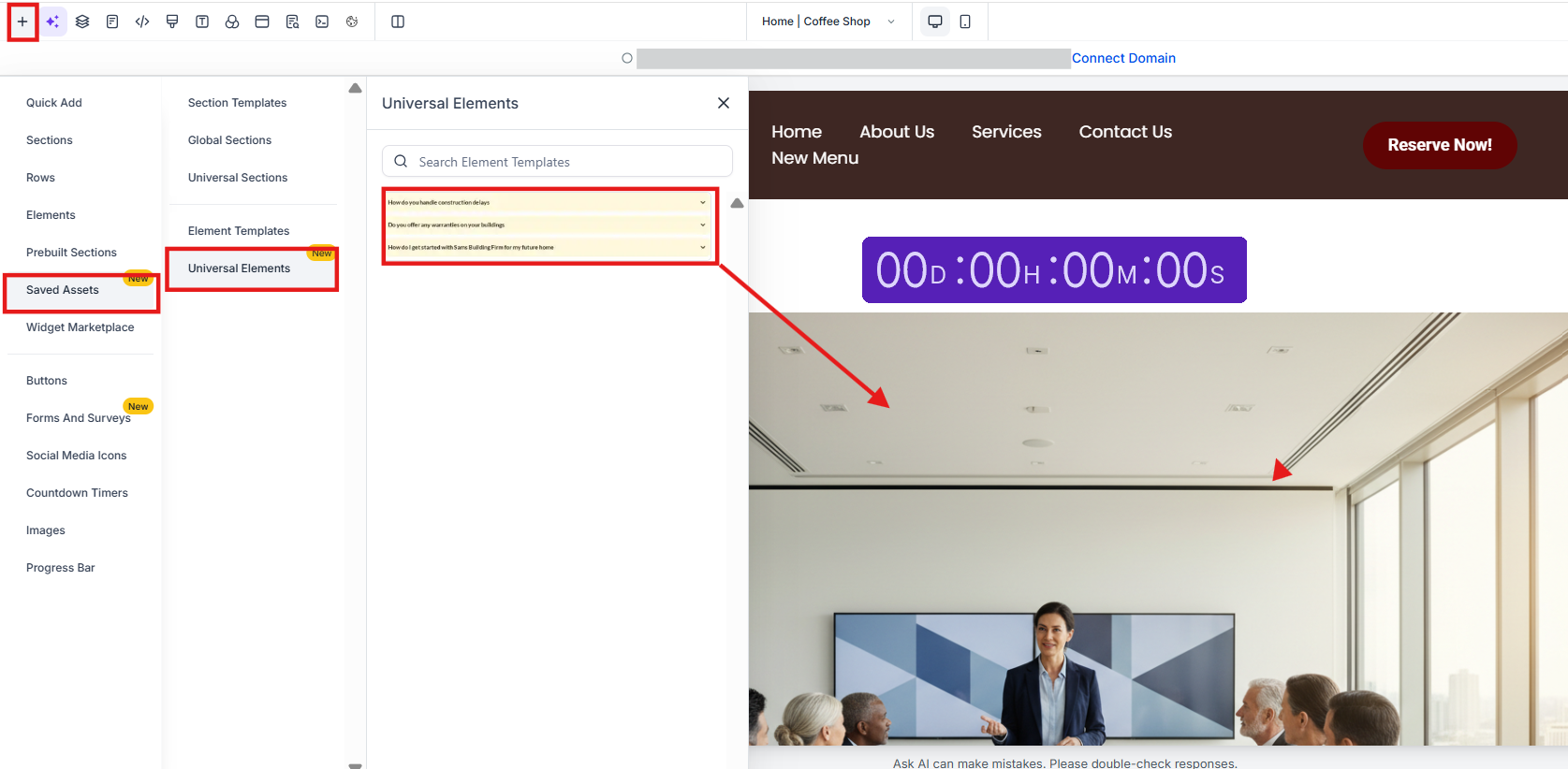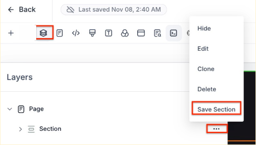- Navigate back to Section by clicking on the layers icon, then on the section, then on the 3 dots, then on Save Section