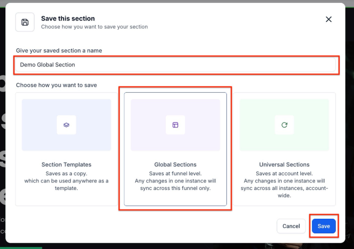 - Name the section and save it as a global section