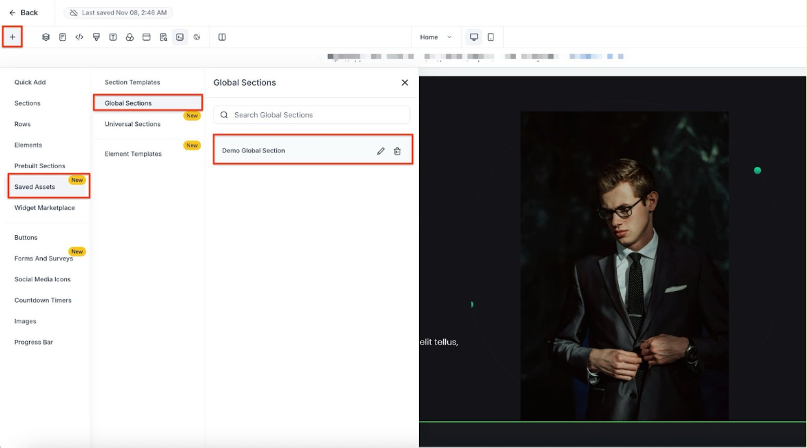 - Answer: Click the + icon in the builder, select the global section you saved, then drag and drop it onto the desired page location and save.