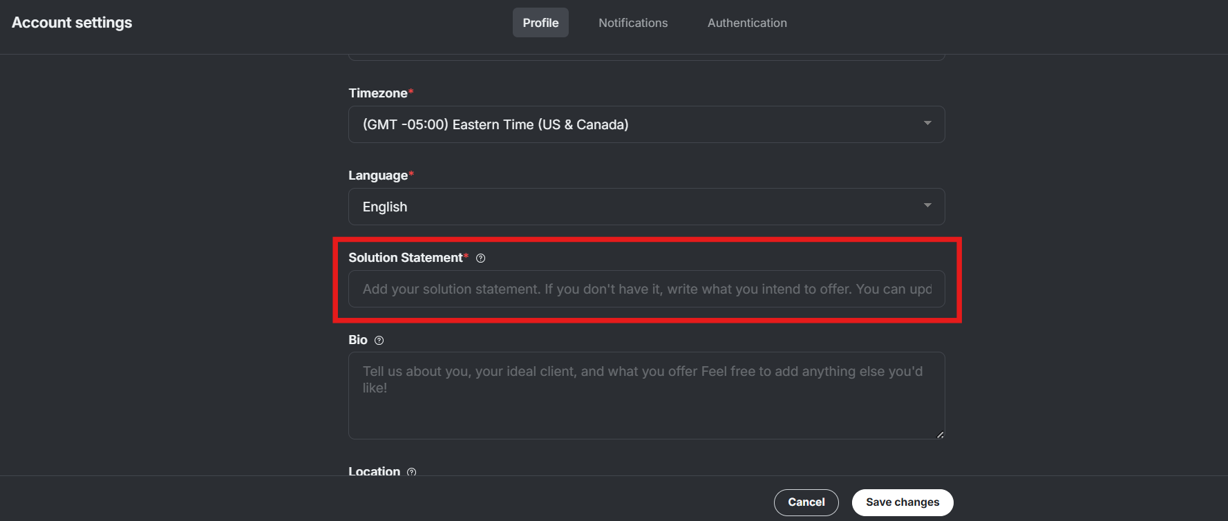 When you join the MBA community, you’ll be asked to confirm your Account Settings - one of those being your Solution Statement. Don’t worry if you don’t have one yet! Just share a few quick details about yourself, your business, or your mission, then hit Save Changes to move forward. You can come back to this page to update and refine your Solution Statement later on!