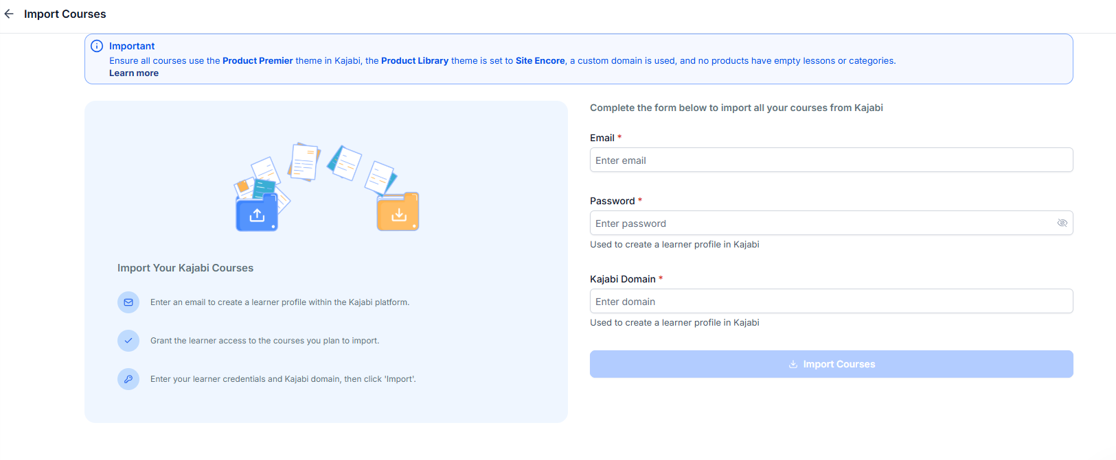 - Once the import process begins, you'll be logged in using your learner credentials, and the courses will start importing.