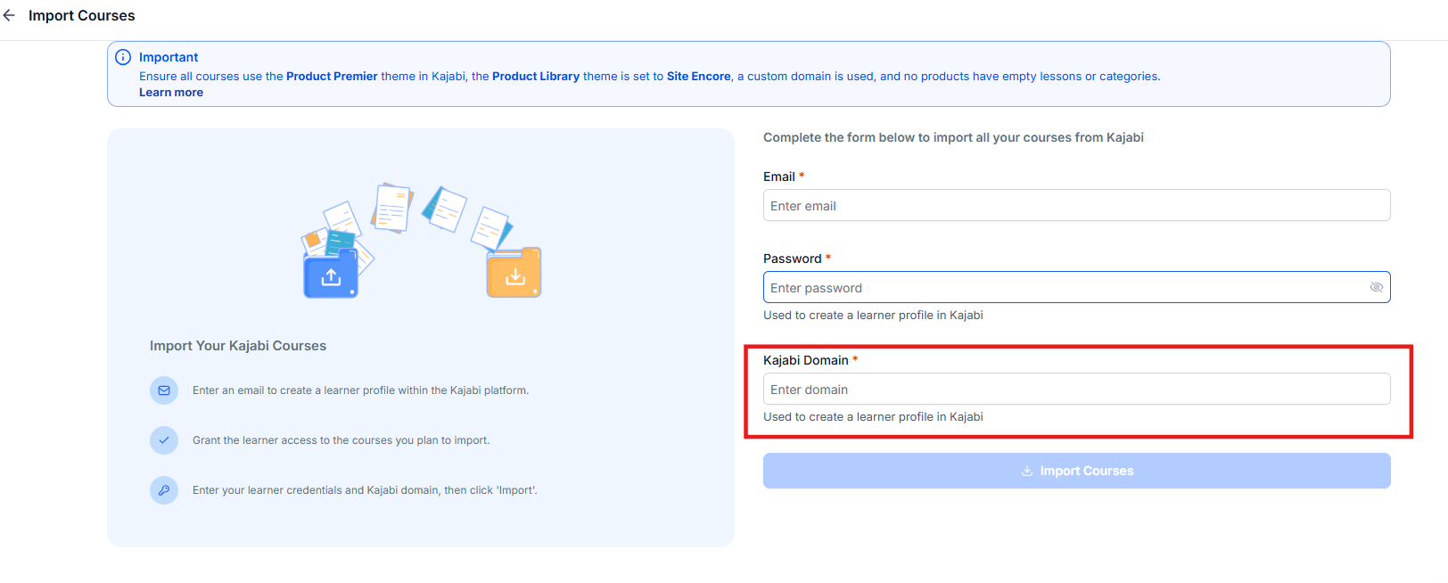 Look for the option to import from Kajabi. Once located, click on it, and a dialogue box will appear prompting you to enter your Kajabi email address, password, and domain. Follow the next steps to get the details to create the new contact based on the email provided (#1) with the password (#2) and also to get the domain to enter in the course importer (#3).