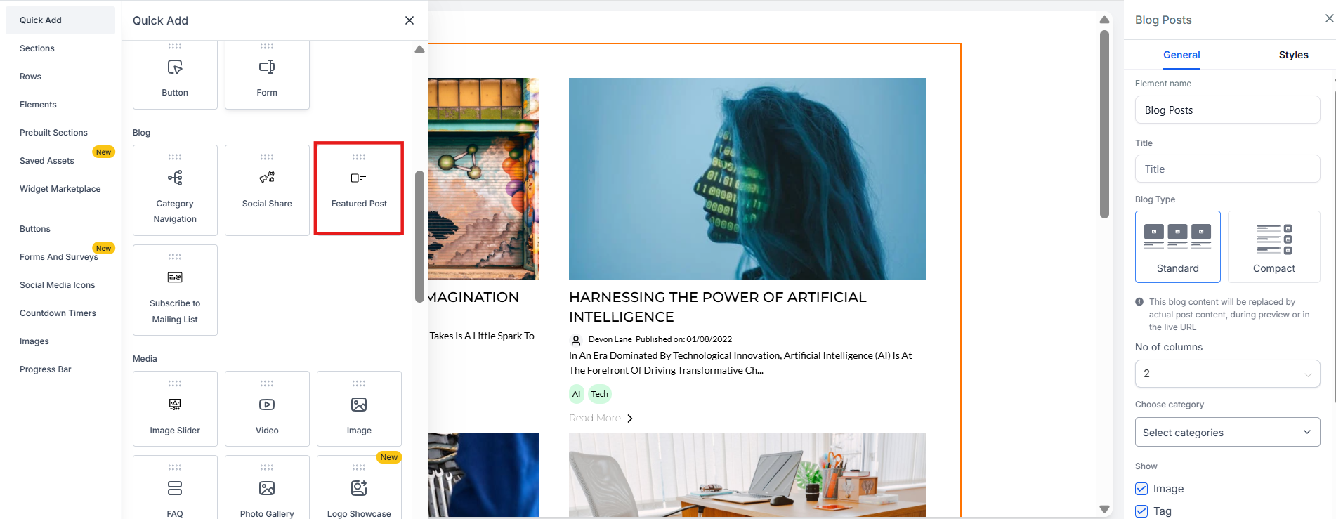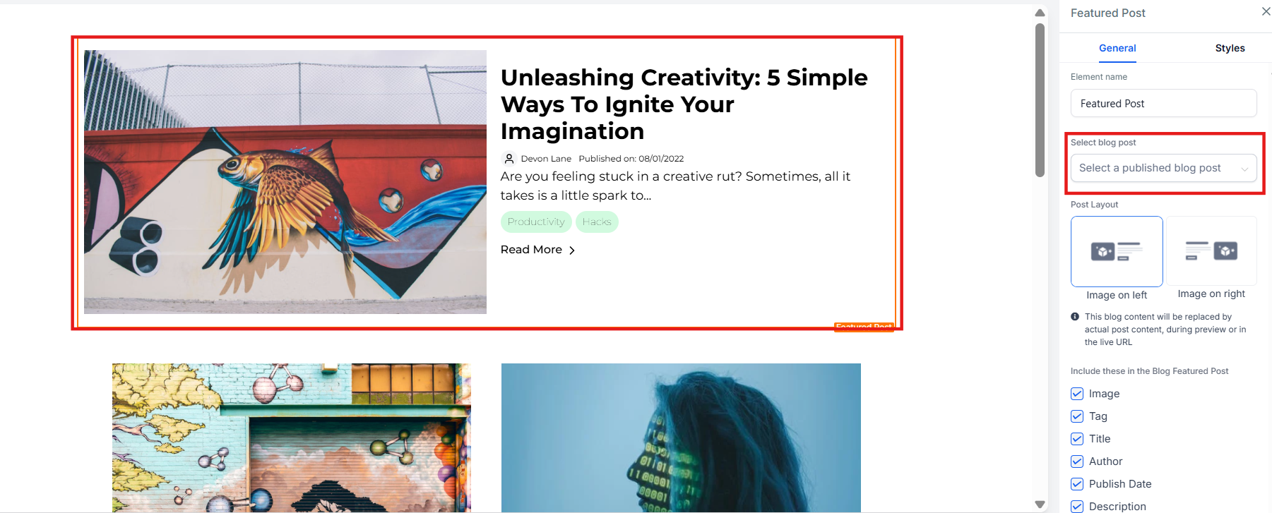 - In the editing section, add the Featured Post element to the blog.