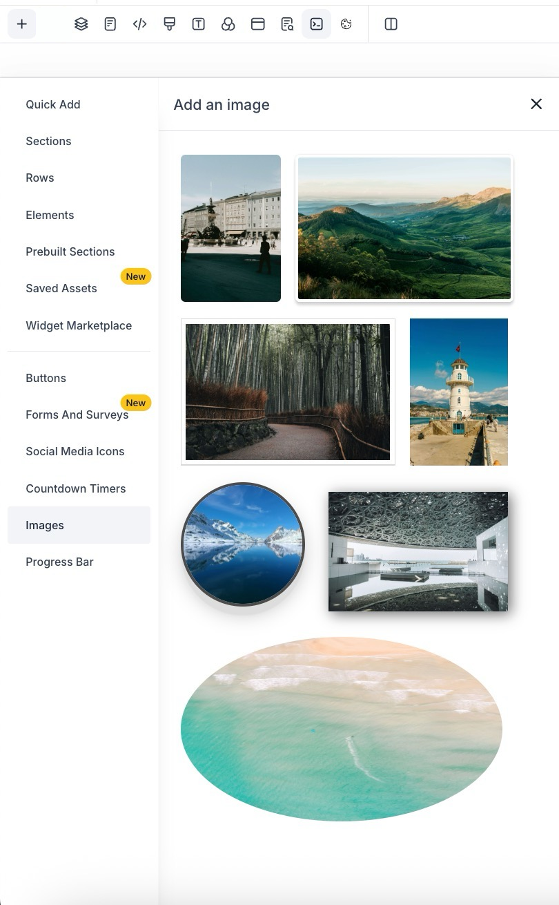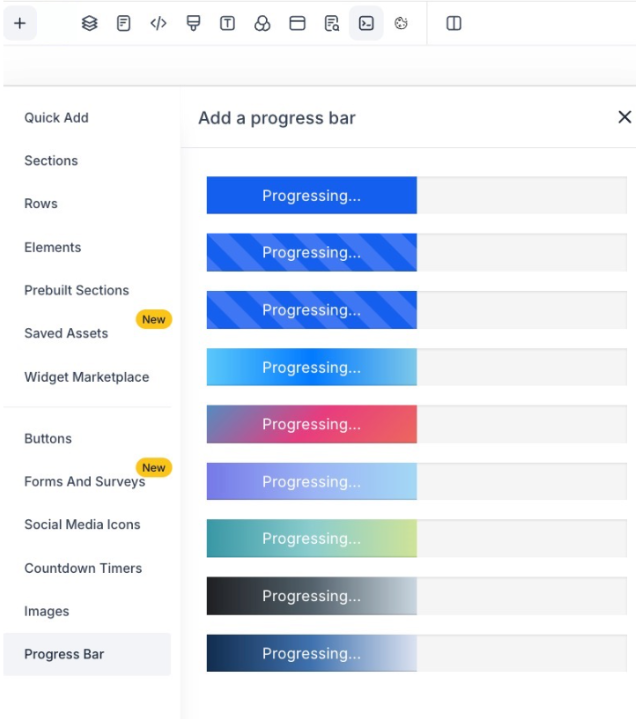 - Explore and select from various options like buttons, social media icons, images, and progress bars.