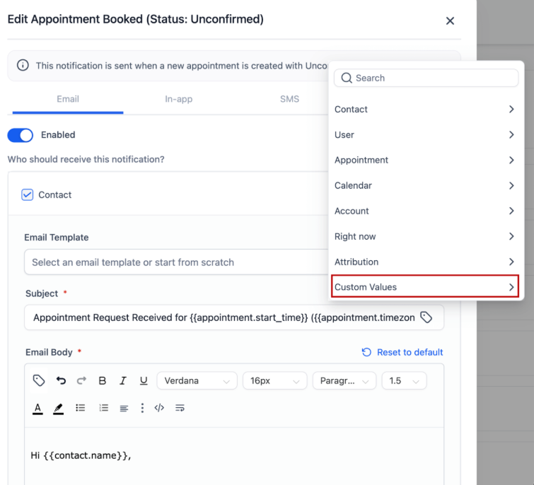 By using custom fields and values, you can ensure that appointment titles, locations, and messages always display the most accurate data for your business. To use this, simply go to your Calendar Settings > Edit the calendar that you want to me changes to > go to Notifications & Additional Options > Edit the email notification that has email enabled > expand where it says ‘Contact,’ click on a text box (email body or subject), open the "Custom Values" menu, and pick the value you want to insert. You can use your custom values to personalize messages and power up your lead info.