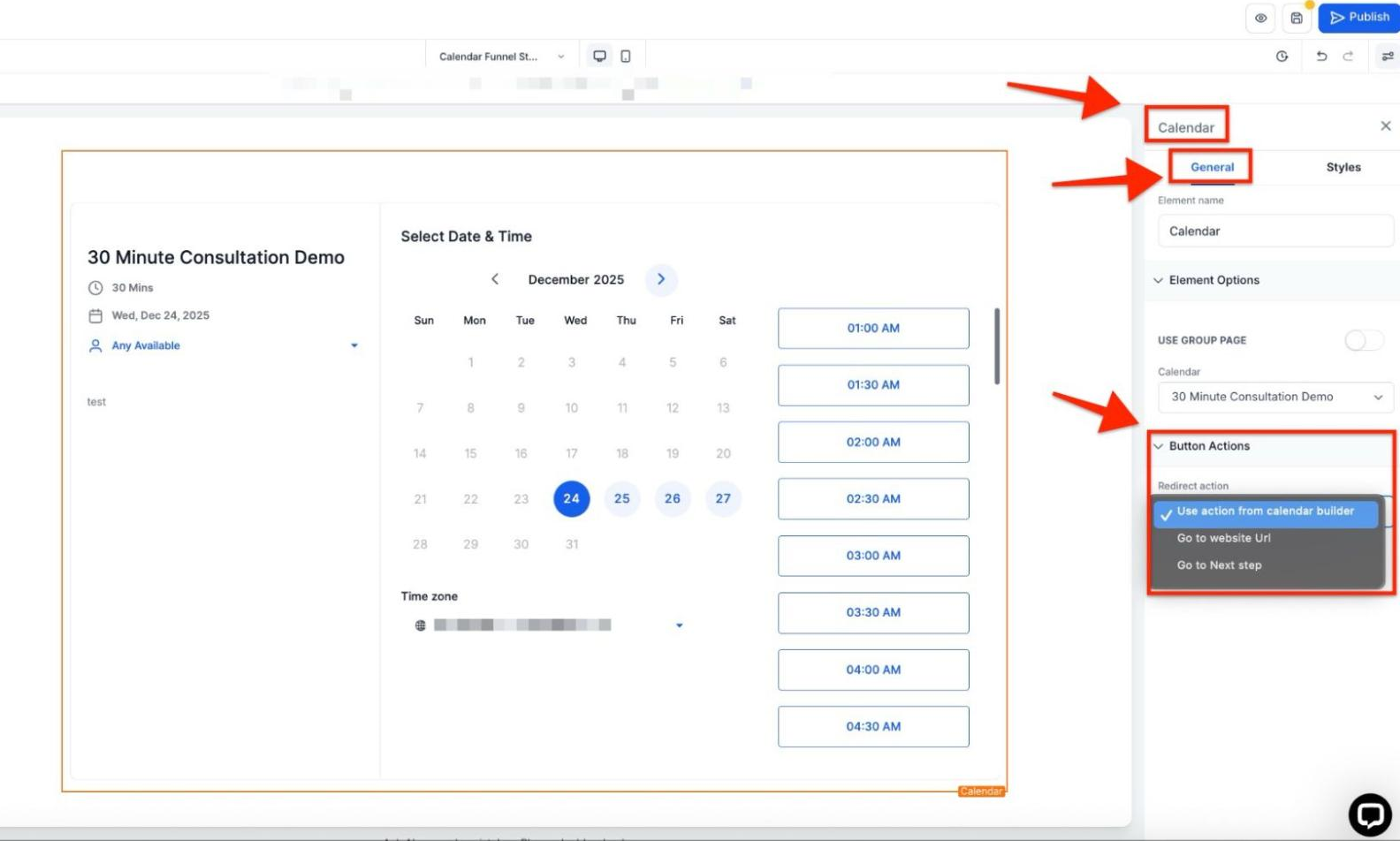 - Open your funnel or website editor where your calendar page is located.