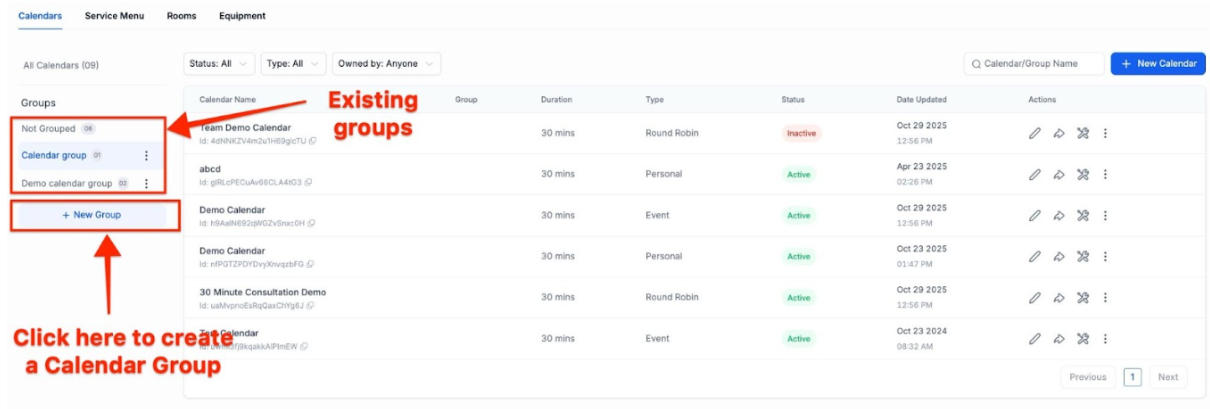 In order to move a calendar to a group, you will need to have a group. You can create a group by clicking ‘New Group’